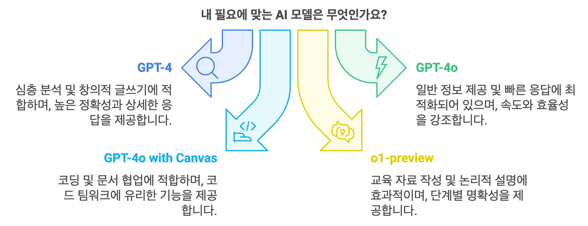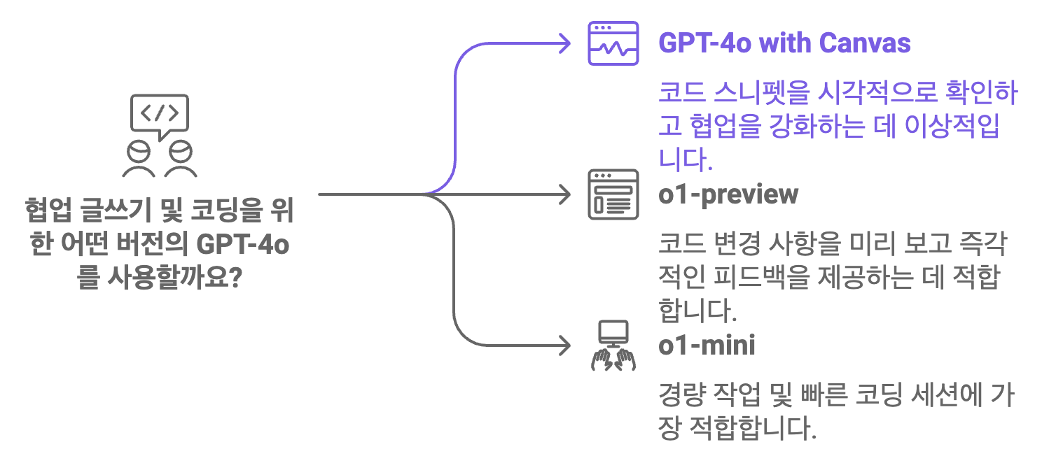 | GPT-4o with Canvas | 코딩 및 문서 협업 | 코드 협업에 유리한 기능 제공 |